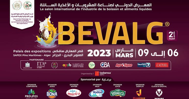 تحت رعاية وزارة التجارة وترقية الصادرات، تتشرف مؤسسة “تادامسا إكسبو” بتنظيم الطبعة الثانية للمعرض الدولي لصناعة المشروبات والأغذية السائلة “بيفالج – ®BEVALG”، وذلك خلال الفترة الممتدة من 6 إلى 9 مارس 2023 بقصر المعارض الصنوبر البحري، حيث ستشهد التظاهرة مشاركة أزيد من 80 عارضاً من الجزائر ومن دول أجنبية عدة، في كافة نشاطات صناعة المشروبات والأغذية السائلة.