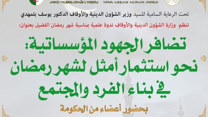 تحت الرعاية السامية لوزير الشؤون الدينية والأوقاف الدكتور يوسف بلمهدي، تنظم وزارة الشؤون الدينية والأوقاف ندوة علمية وطنية بمناسبة شهر رمضان الفضيل، تحت عنوان: “تضافر الجهود المؤسساتية نحو استثمار أمثل لشهر رمضان في بناء الفرد والمجتمع”، وذلك يوم الإثنين 21 شعبان 1447هـ الموافق لـ 09 فيفري 2026م، بالمدرسة الوطنية دار الإمام المحمدية بالجزائر العاصمة، بحضور أعضاء من الحكومة، وأعضاء من اللجنة الوزارية للفتوى، وأئمة ومرشدات دينيات، إلى جانب نخبة من الإطارات السامية، والباحثين، والأكاديميين، والمختصين.